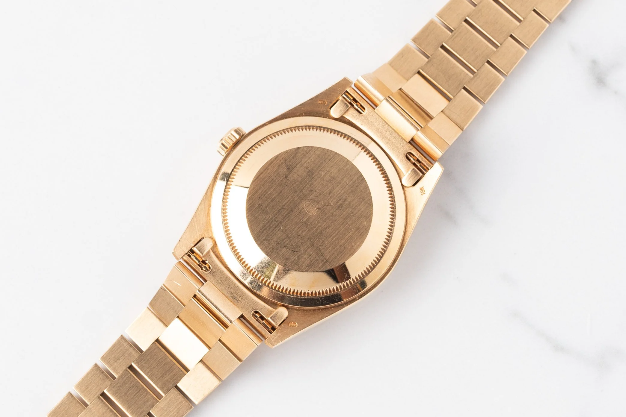 Day-date reference 18238 with the double quick day/date setting, in fantastic vintage condition. Despite its age, the watch has an incredibly sharp case, bezel, and bracelet. There is almost no slack on the bracelet. The watch exhibits a French hallmark on the caseback as well as the clasp, as required for watches sold in France. The day-date with champagne dial remains an all time classic.