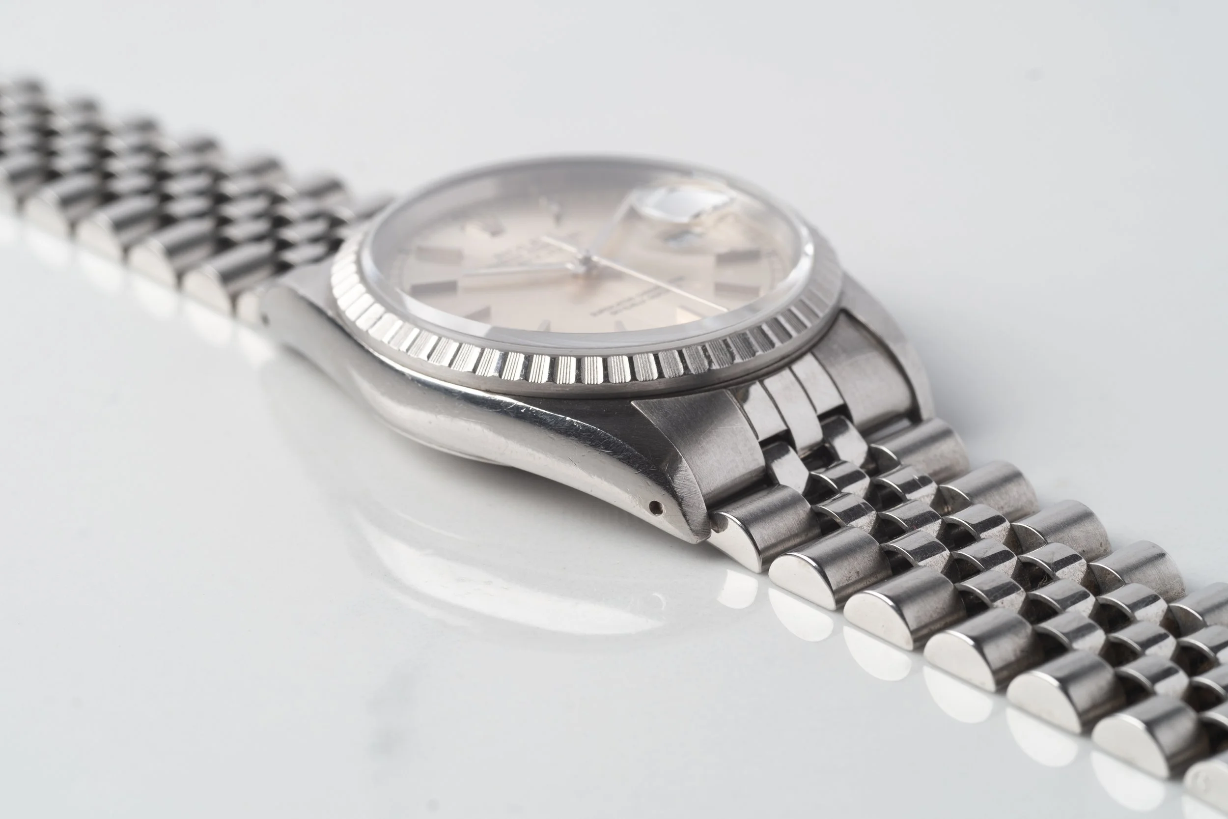 Rolex Datejust reference 16220 with engine turned steel bezel, and silver dial. The watch is in preowned condition with signs of use throughout the case. Watch case remains very thick, and the steel bezel defined. Comes with original Japanese warranty papers.