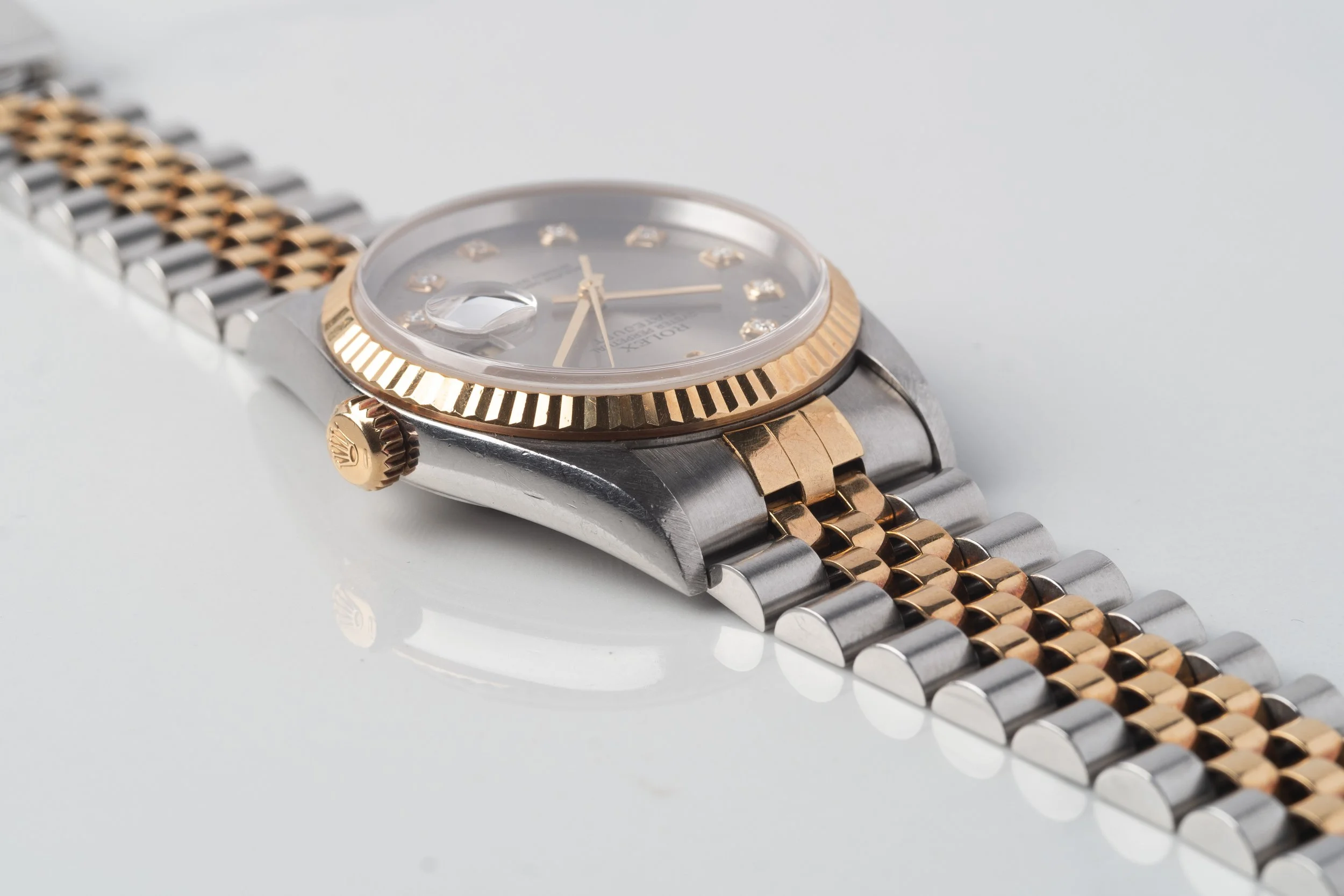 Size matters! Stunning uncommon factory gray dial with large, encased diamond setting, which can only be found starting from the late 90s. Correct non-lumed hands. Exceptionally clean, preowned example with no visible lug holes. Signs of use are present, but the bezel, case and bracelet remain sharp and untouched.