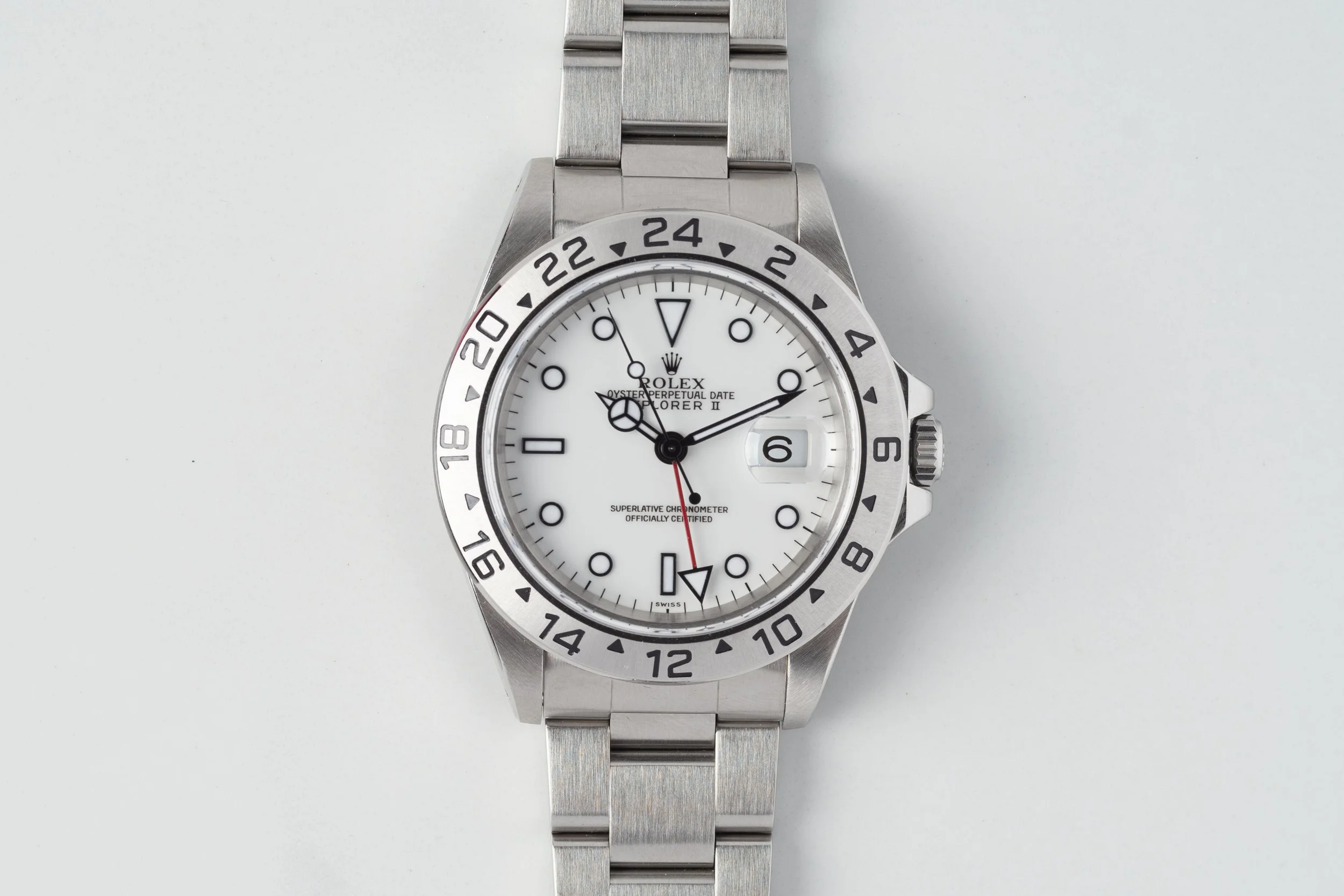Offered is a Rolex Explorer II reference 16570 with the popular Polar dial. This A serial Explorer II has a “SWISS” only dial, which was only produced between the years 97-99. In addition to having its original warranty papers, the watch was previously serviced by RSC in 2020. Excellent condition with sharp bezel and lugs and ready to wear.