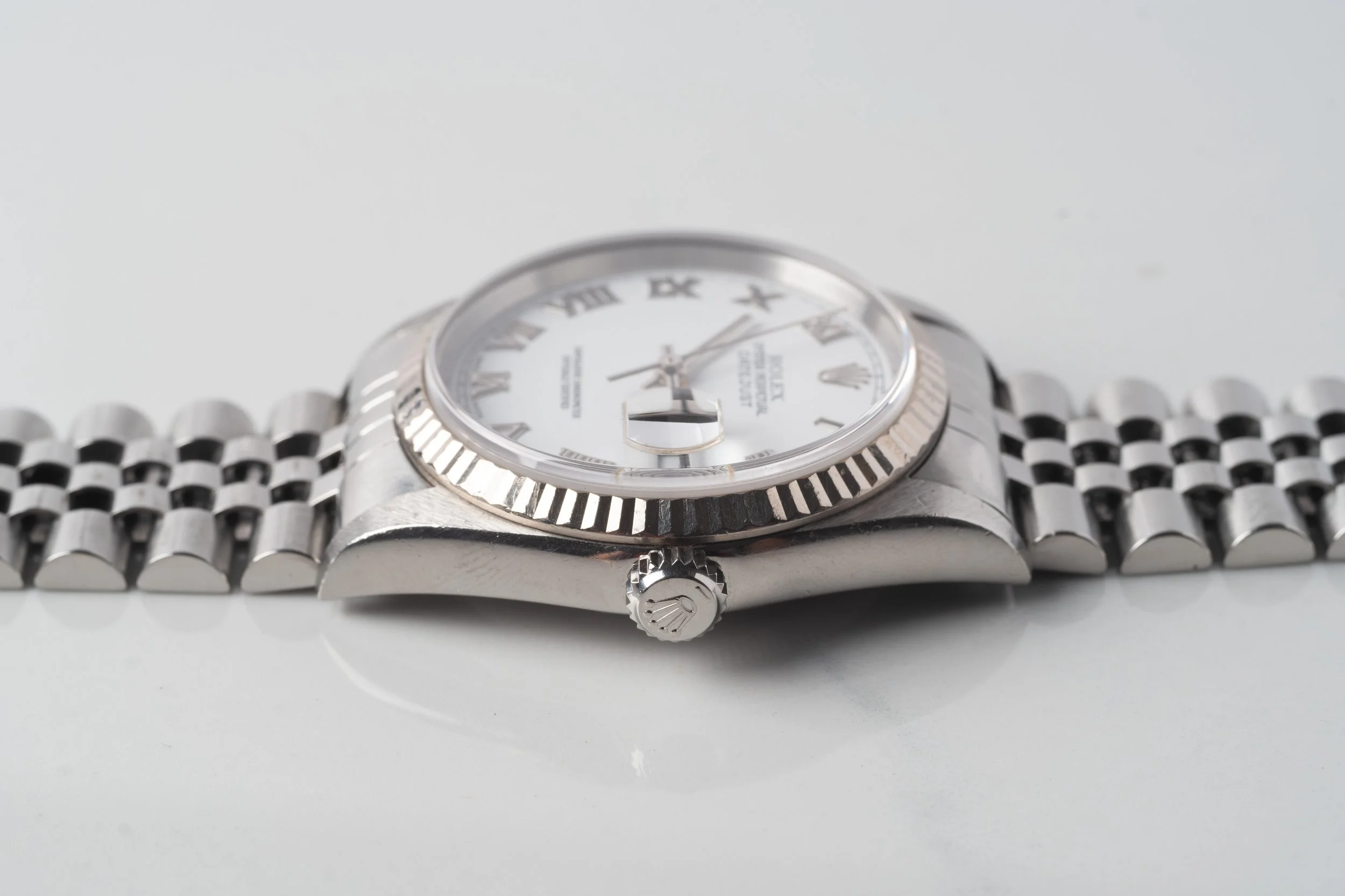 Classy white roman dial creates a clean aesthetic on the dial of the watch. Non lumed hands to complete the look. Case and bracelet are in great condition, with minor slack only.