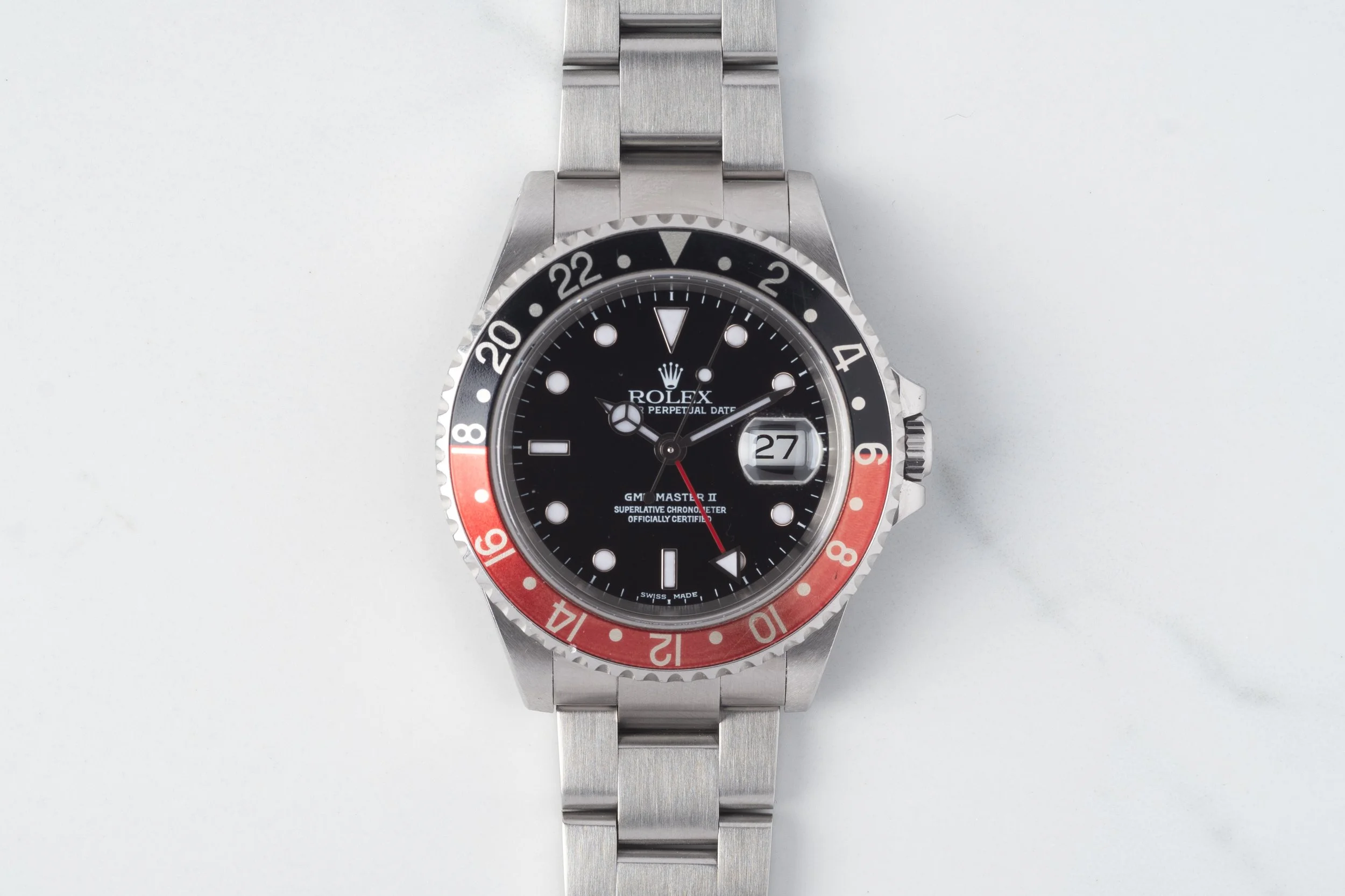 Rolex GMT-Master II 16710 with red/black “Coke” bezel. With a K serial production, the watch has a transitional combination of lug holes and solid end link bracelet. The watch has a very nice case, thick lugs and minor signs of wear. The bezel has a very nice fade to it, with both the red and black portions a shade lighter than it originally was. Bracelet is in very good condition.