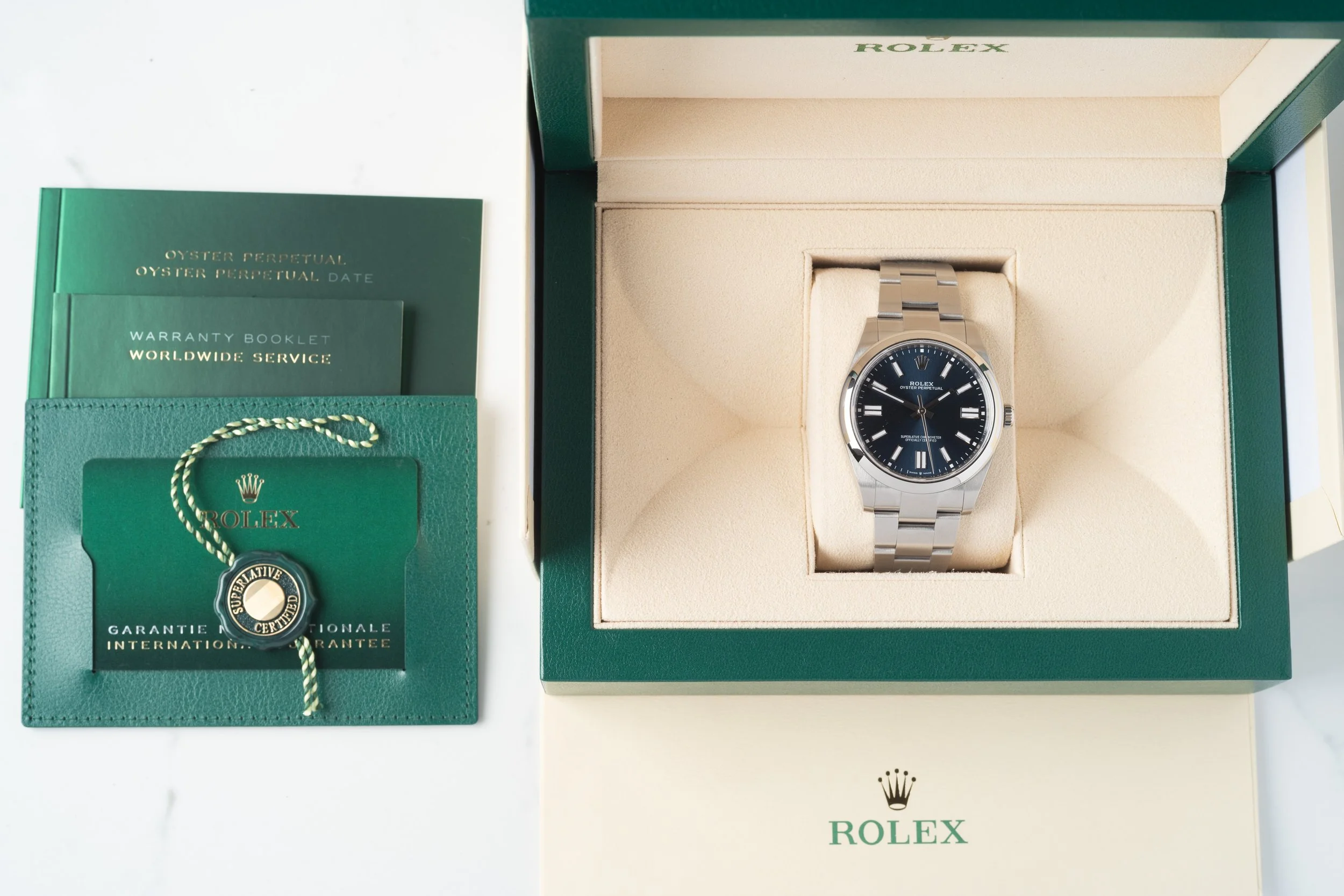 Box - Papers - Accessories: outer box, inner box, green card holder, warranty booklet, oyster perpetual booklet, warranty card dated 2022